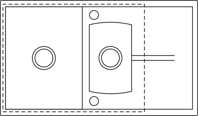 - Oblast dřezu, která je označena přerušovanou čarou ukazuje kolik místa potřebuje dřez uvnitř kuchyňské desky. Pro jistotu je však lepší počítat s nezbytným prostorem o 2 cm větším.